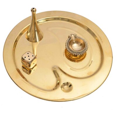 Set Contents: 1 Thali (Tray), 1 Diya (Lamp), 1 Brass Die (Dice), 1 Conical Bell/Totem