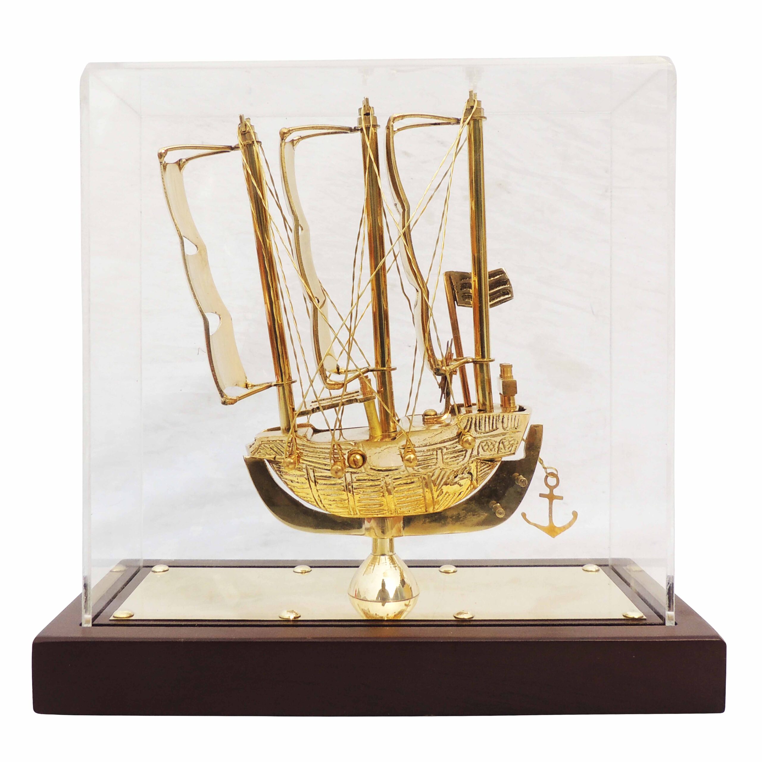 Navigate your way to elegant home or office decor with this exquisite Brass Sailing Ship Model. Encased in a clear, protective display box, this piece captures the spirit of maritime adventure with a touch of luxury. The gleaming gold-tone finish makes it an eye-catching centerpiece, perfect for executive desks, bookshelves, or mantels.