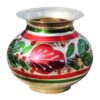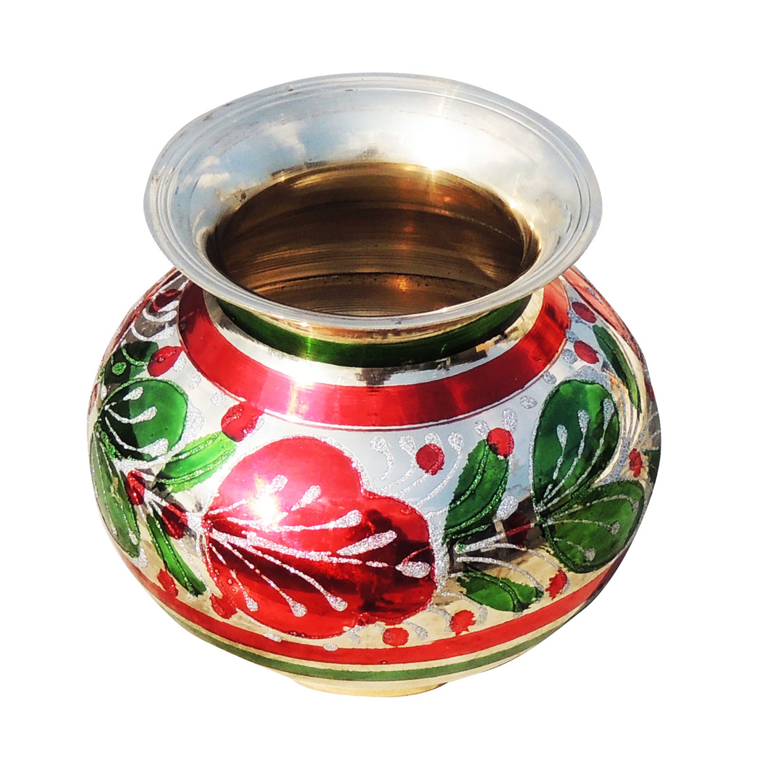 Standing at a compact height of 3.5 inches, this Kalash is perfect for daily rituals, Kalash Sthapana during Navratri, or as a decorative accent during weddings and Diwali. The combination of the golden brass base with the rich, colorful enamel work makes it a striking piece that blends spirituality with traditional artistry.