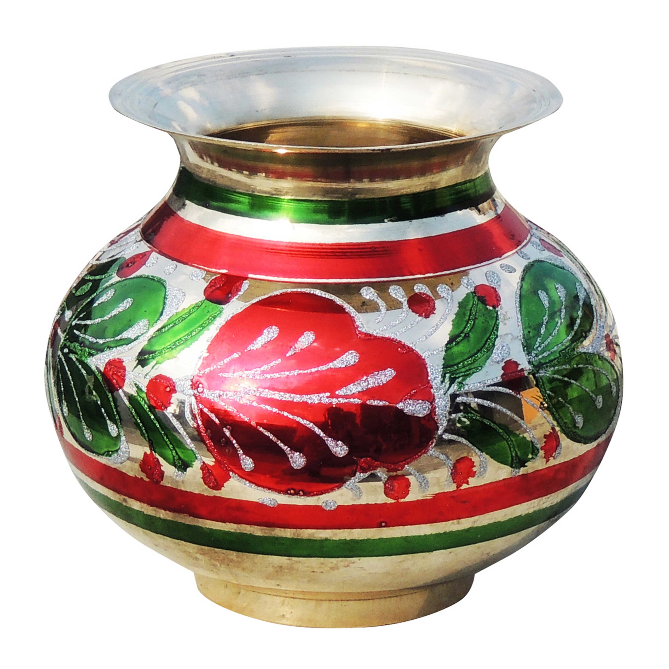 Infuse your puja room or festive decor with vibrant energy using this beautifully hand-painted brass Kalash (Lota). Traditionally crafted from high-quality brass, this vessel is adorned with auspicious red and green bands and features elaborate floral motifs accented with sparkling silver glitter details.