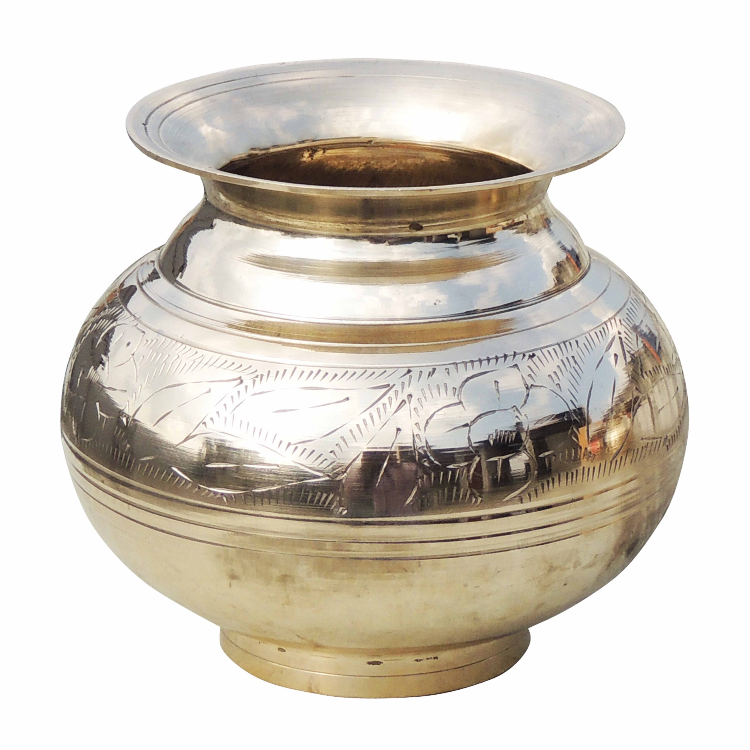 Intricate Craftsmanship: Features detailed hand-etched traditional motifs on a high-gloss brass surface.